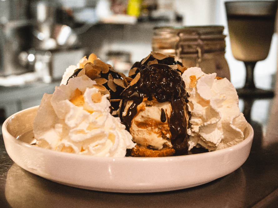 choux, glace vanille noix de pécan, sauce chocolat, chantilly